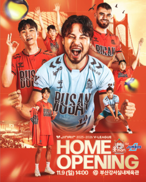 [더게이트]OK저축은행 읏맨 프로배구단이 9일 부산 강서실내체육관에서 2025~2026 진에어 V리그 홈 개막전을 연다. 부산으로 연고지를 옮긴 뒤 치르는 첫 홈 경기다. '부산 OK'의 시작을 알리는 무대가 펼쳐진다.구단은 이날 경기장을 찾는 모든 관중에게 험멜 응원 티셔츠를 제공한다. 선착순 1000명에게는 부산 첫 홈 경기 기념 오프너도 증정한다. 경기장 안팎에는 어린이 팬을 위한 '읏맨 풍선 아트 부스'와 배구를 직접 체험할 수 있는 '읏배구 그라운드! 배구 체험존 BIG3', 월드비전과 함께하는 타투 스티커 부스 등을 설치