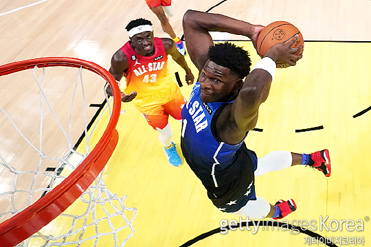[스포츠춘추] 두 손 높이 들고 팔을 머리 뒤로 젖혔다. 최대한 날아올라서 내리찍을 준비를 마쳤다. 눈앞에 보이는 건 림뿐. 2월 20일 미국 유타 주 솔트레이크 시티 비빈트 아레나에서 열린 2022-2023시즌 미국 프로농구(NBA) 올스타전. 앤서니 에드워즈(21·미네소타 팀버울브스)가 림을 부술듯한 덩크슛을 시도하고 있다.