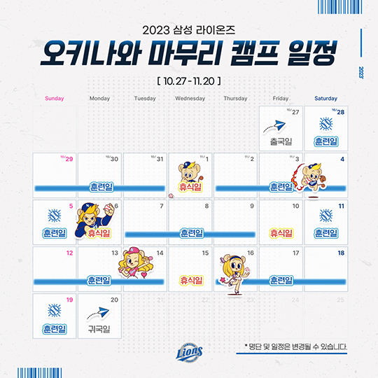 · 10월 27일 인천공항에서 출국 예정인 선수단은 오키나와 온나손에 위치한 아카마 구장에서 27일부터 11월 20일까지 총 24박 25일간 캠프 일정을 소화한다.