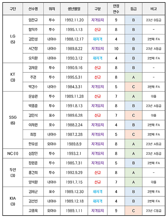 · 2024년 FA 자격 선수는 A등급 8명, B등급 14명, C등급 12명 등으로 총 34명이다. 그중 ‘최대어’로는 두산 내야수 양석환(A등급), 롯데 내야수 안치홍(B등급), LG 임찬규(B등급) 등이 손꼽힌다.