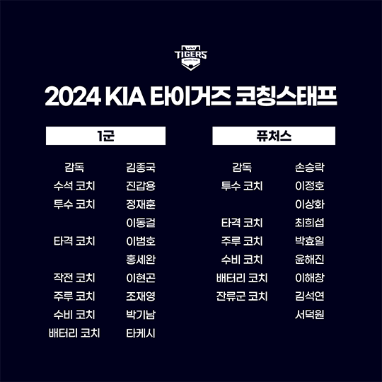 KIA 타이거즈가 2024시즌 코칭스태프 보직을 확정했다. 다음은 KIA 구단이 12월 20일 발표한 코치진 관련 세부 내용이다.