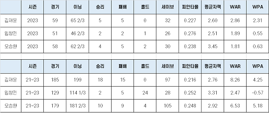 두 수장이 머리를 맞대고 2024년 대비 1순위 과제로 손꼽은 건 불펜 보강이었다. 삼성의 뒷문은 직전 시즌 내내 부진을 면치 못했다. 팀 불펜 평균자책(5.16)이 KBO리그 10개 구단 가운데 최하위였고, 야구통계사이트 ‘스탯티즈’에서 제공하는 불펜 WPA(추가한 승리 확률)는 삼성의 경우 팀 전체 -8.43 및 리그 10위다. 참고로 WPA는 불펜의 팀 기여를 언급할 때 주로 쓰인다.
