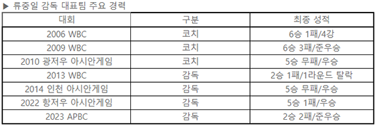 이로써, 2년 연속 태극마크를 단 류 감독이다. 지난해 유망주 위주로 대표팀을 구성한 류 감독은 항저우 아시안게임에선 금메달을 수확했고, 그 뒤 11월에 열린 제2회 APBC(아시아프로야구챔피언십)에선 준우승을 거두는 등 성과를 냈다.
