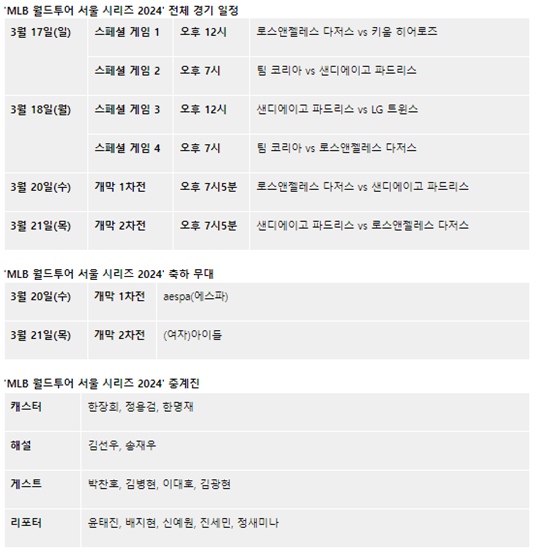 이는 사상 최초로 한국에서 열리는 MLB 정규시즌 개막전으로 큰 의미를 갖는다. 또 빅리그를 대표하는 슈퍼스타 오타니 쇼헤이, 무키 베츠, 프레디 프리먼, 다르빗슈 유, 매니 마차도, 페르난도 타티스 주니어, 잰더 보가츠 등이 참여할 예정이며, 한국인 메이저리거인 김하성, 고우석도 출전한다.
