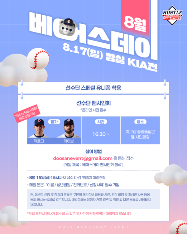 두산은 17일 잠실야구장에서 열리는 KIA타이거즈와 정규시즌 맞대결에서 베어스데이를 맞아 다양한 이벤트를 준비했다. 잭로그와 제이크 케이브가 오후 4시 30분부터 야구장 중앙출입문 옆 사인회장에서 팬사인회를 진행한다. 팬사인회 참가 신청은 15일 오후 3시까지 이메일을 통해 가능하다.