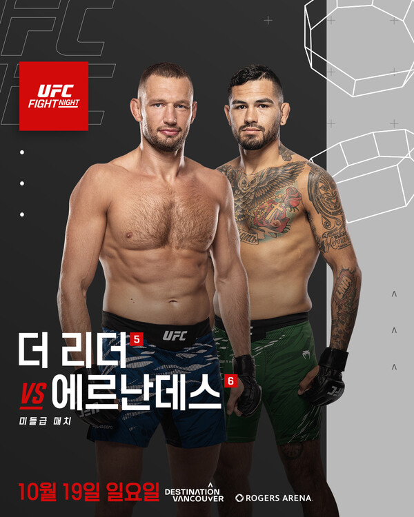 UFC 파이트 나이트: 더 리더 vs 에르난데스 오는 10월 19일(한국시간) 로저스 아레나에서 개최된다. 이번 대회는 데스티네이션 밴쿠버와의 파트너십 하에 개최된다. 메인카드는 한국 시간으로 10월 19일 오전 8시에 중계된다. 언더카드는 오전 5시에 시작한다. UFC 파이트 나이트: 더 리더 vs 에르난데스 티켓은 티켓마스터를 통해 판매되고, 티켓 구매는 인당 8장으로 제한된다.