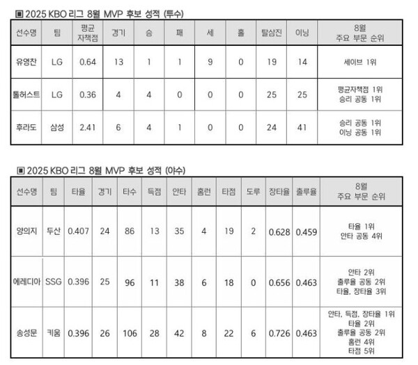 야수 중에는 두산 양의지, 키움 송성문, SSG 에레디아가 후보로 발표됐다. 양의지는 8월 규정타석을 채운 타자 중 유일하게 4할이 넘는 0.407을 기록하며, 월간 타율 1위에 올랐다. 키움 송성문은 8월 안타 1위(42개), 타율 2위(0.396), 장타율 2위(0.726), 홈런 4위(8개) 등 타격 주요 부문에서 모두 5위 이내에 이름을 올렸다. 에레디아는 월간 안타 2위(38개)와 타율 3위(0.396)에 올랐다. 8월에만 홈런 6개를 몰아치며 장타율도 0.656(3위)를 기록했다.